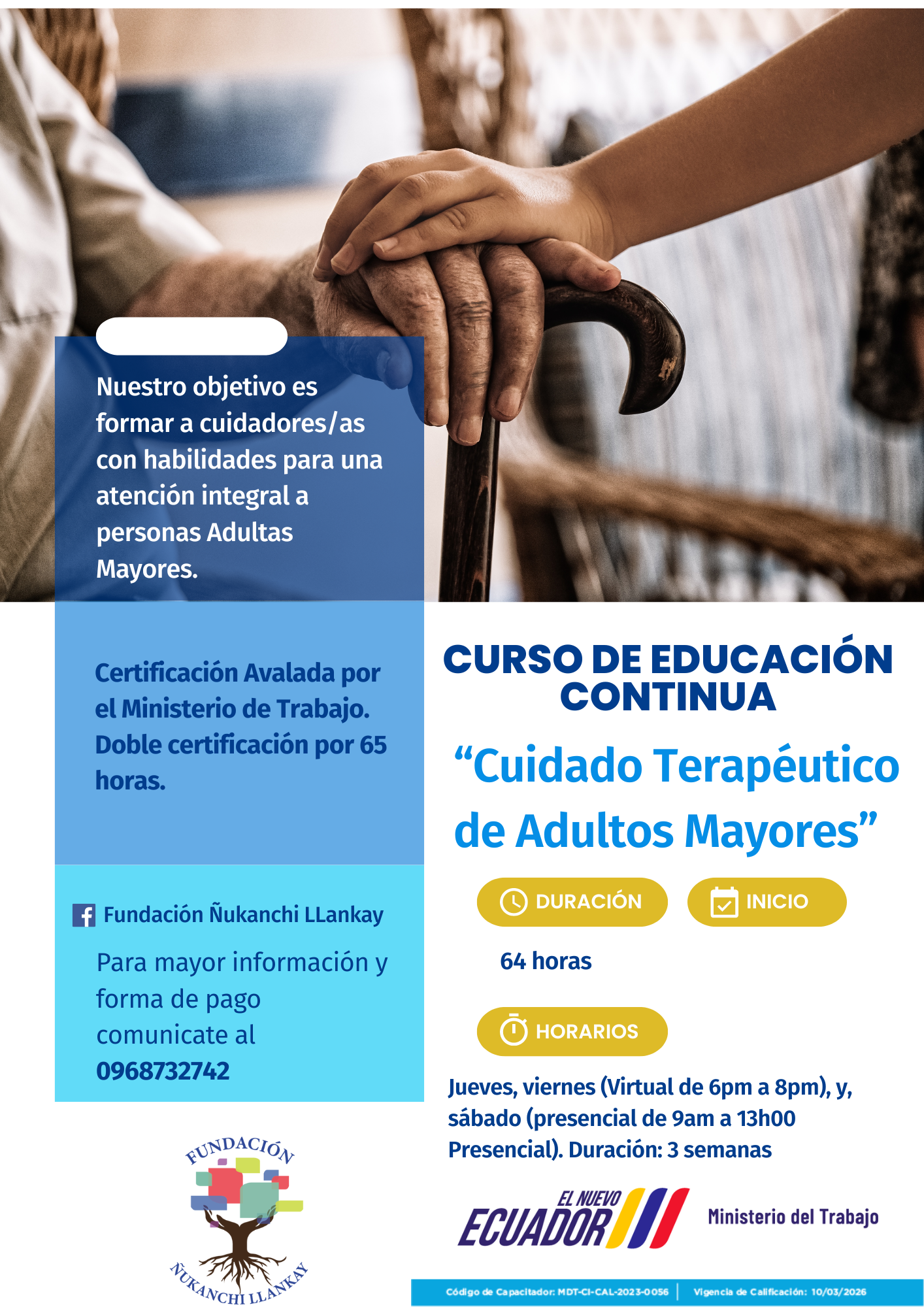CURSO DE FORMACIÓN CONTINUA "CUIDADOS TERAPEUTICOS DEL ADULTO MAYOR"El curso tiene como objetivo, fomentar y desarrollar habildiades para el cuidado integral de personas adultas mayores. Inscripción al curso "Prevención de Violencia en Género"El curso tiene como objetivo generar estrategias para la prevención de la violencia de género.